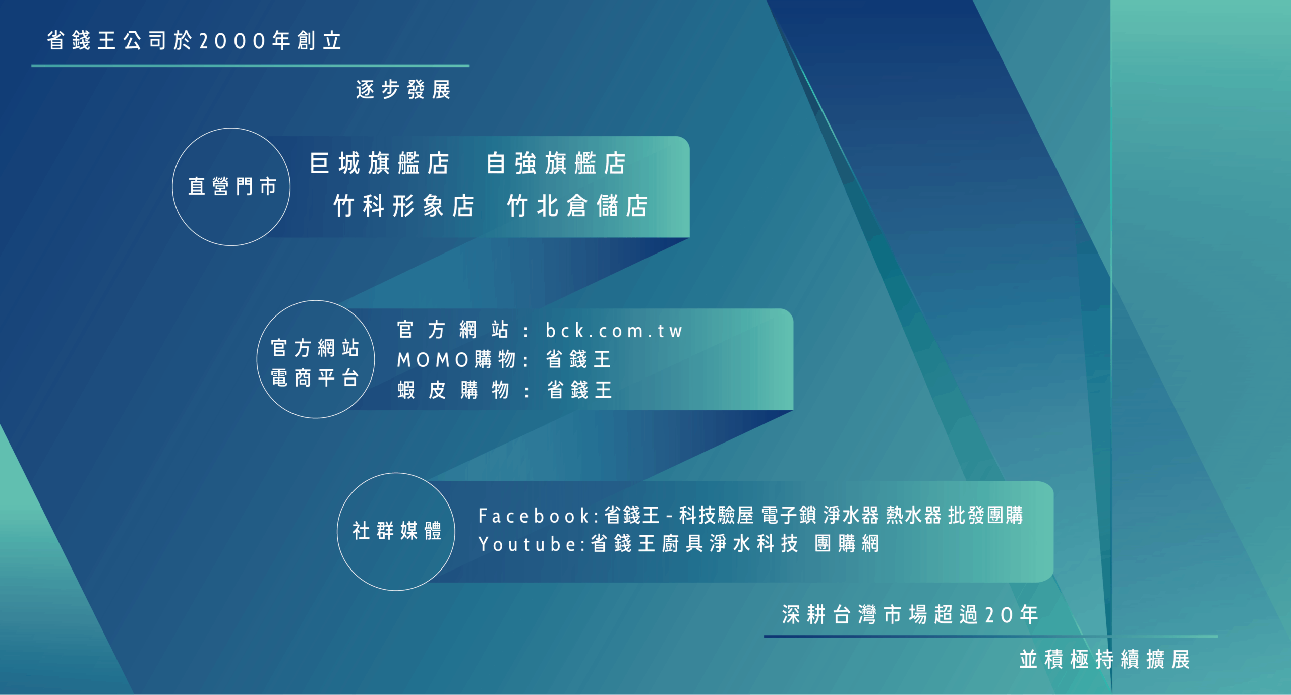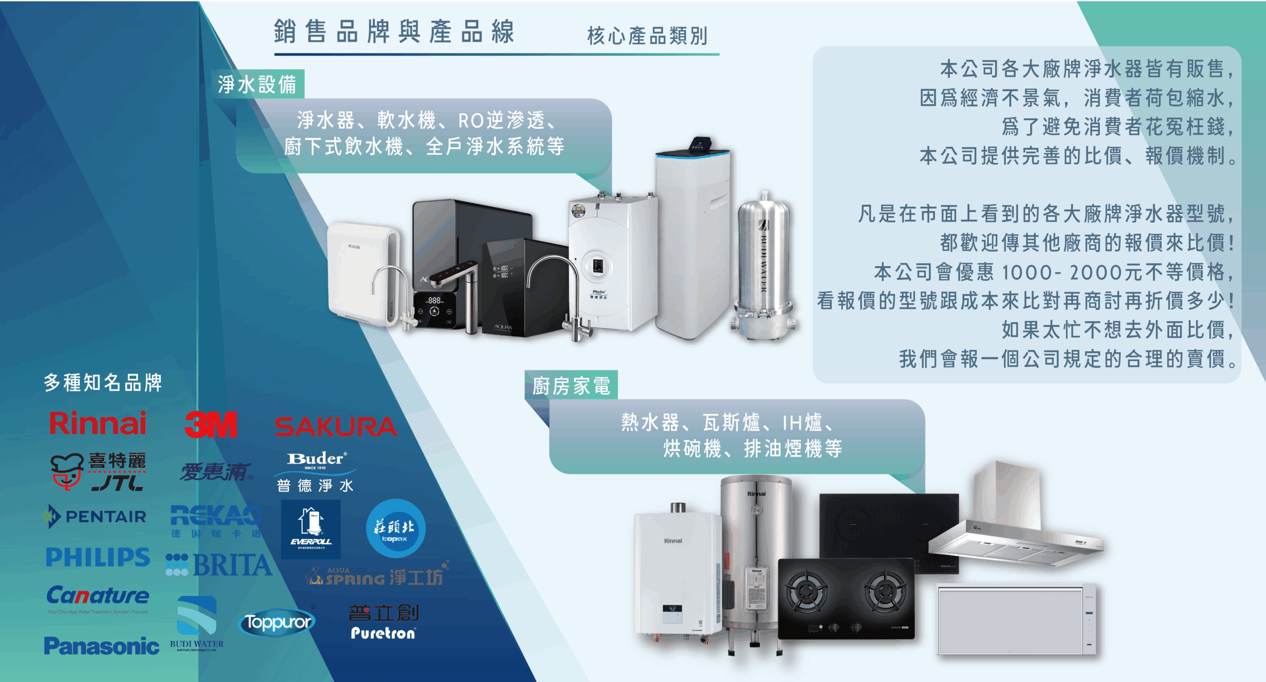 授權經銷多家知名品牌淨水器、熱水器、電子鎖、廚房三機、五金精品等,