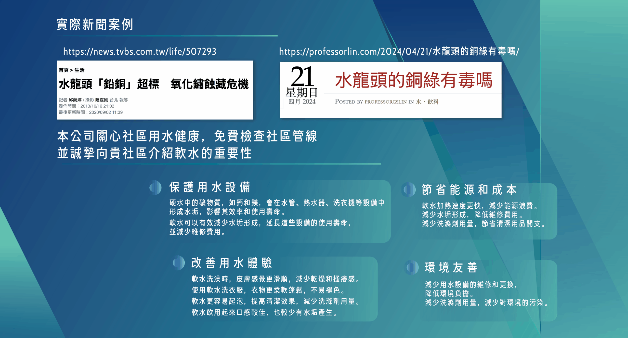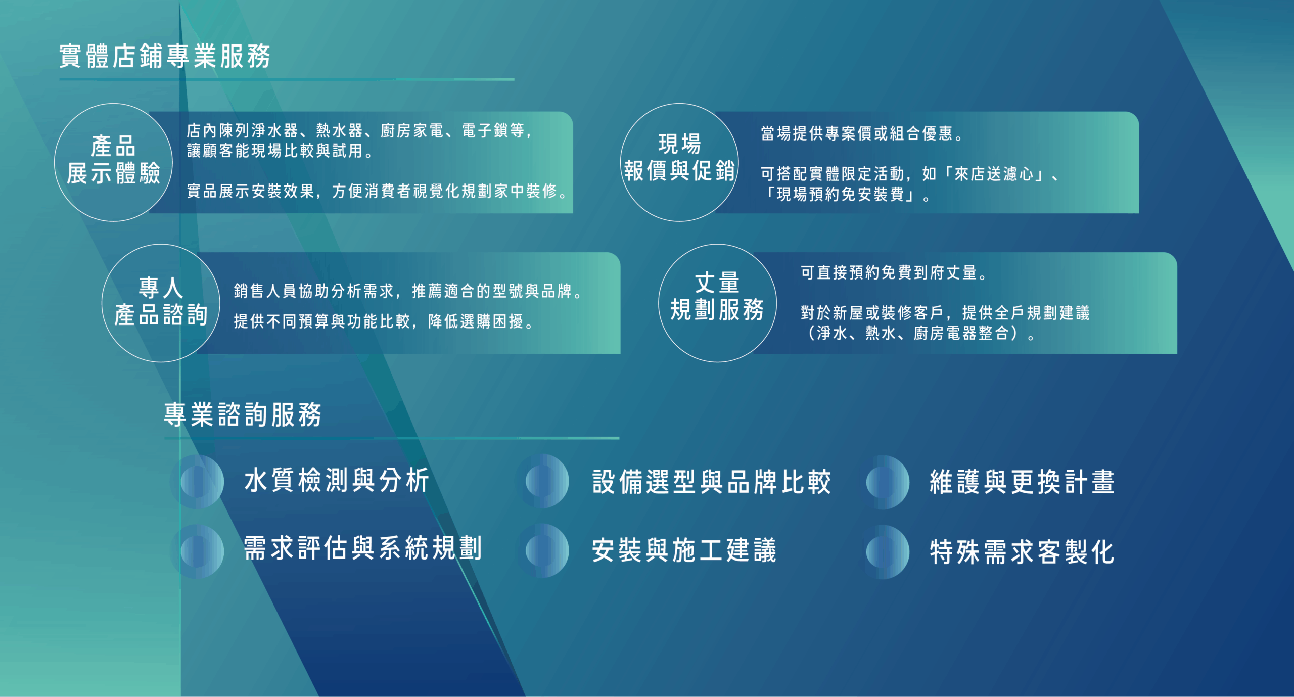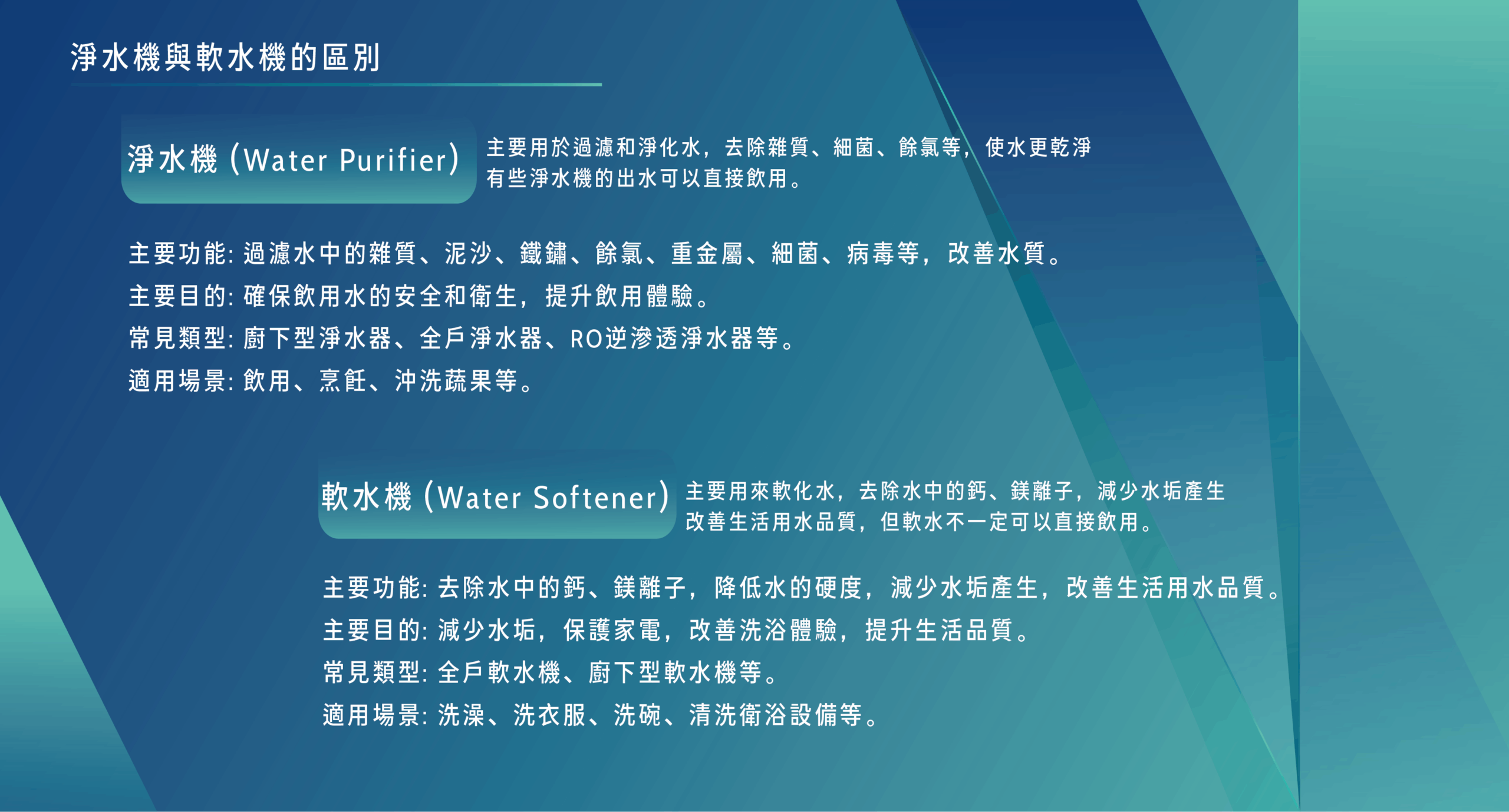 本公司經營強項 : 軟水機、全戶淨水不鏽鋼壓接配管、廚下淨水器、加熱器、熱水器