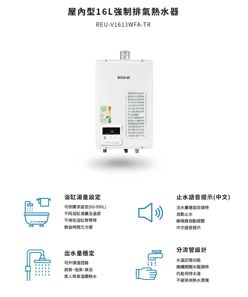林內Rinnai REU-V1613WFA-TR 屋內型 16L 強制排氣熱水器